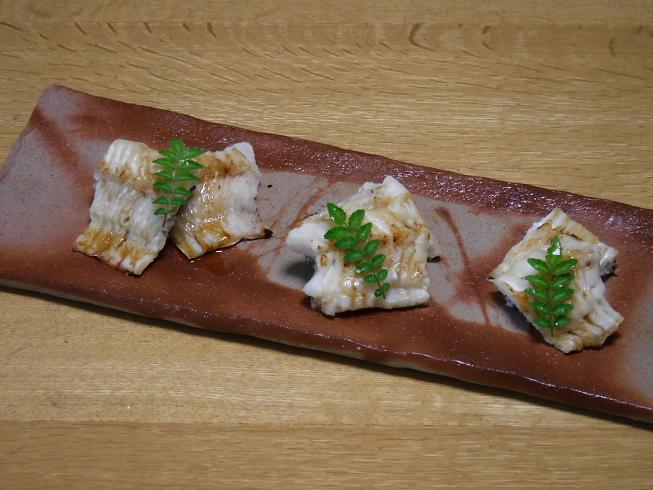 鱧の照り焼き@火襷長方皿(高力芳照作)。