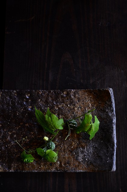長方たたき皿(多久守)、オキナワスズメウリをのせて。